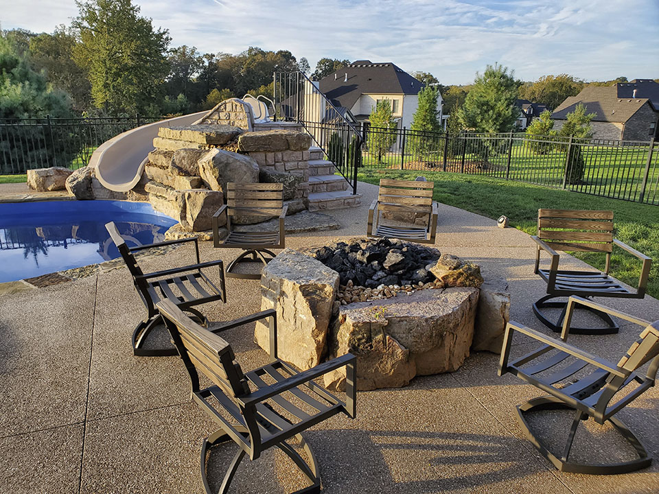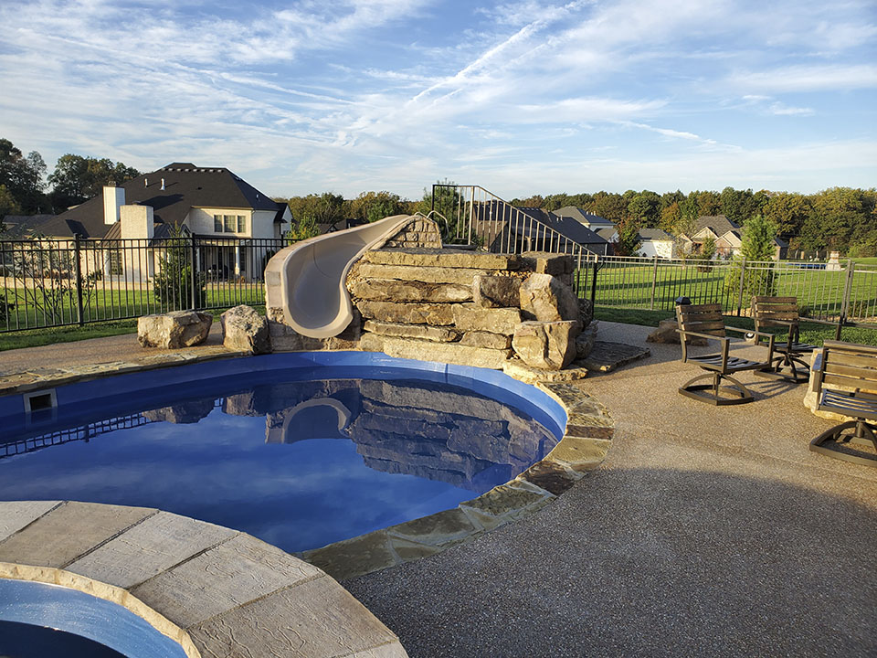 This is a Trilogy fiberglass pool and spa by Latham Pools. With a slide, a waterfall with a diving rock, a gas burning automated fire pit, and an outdoor kitchen there is truly something for everyone!