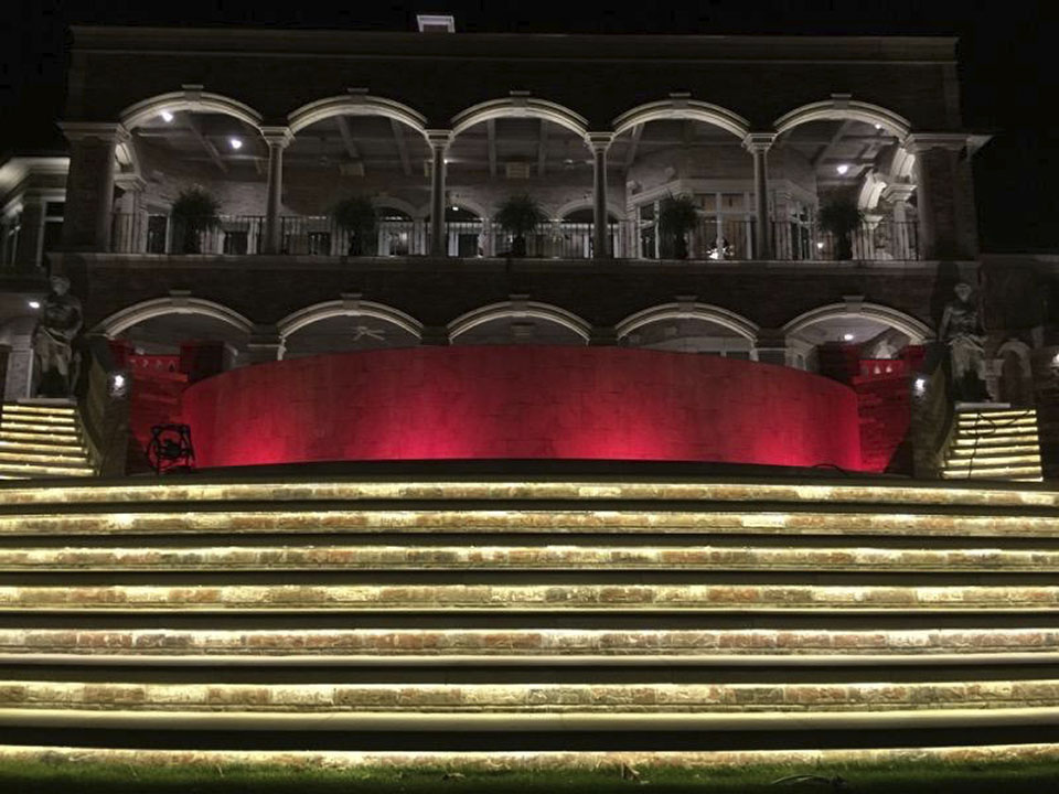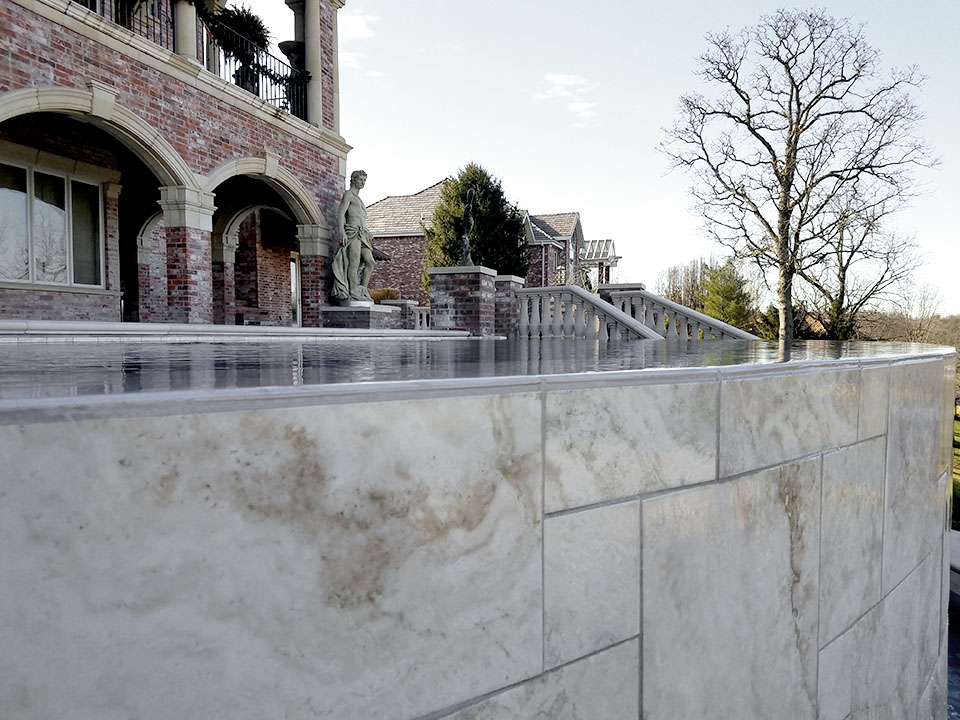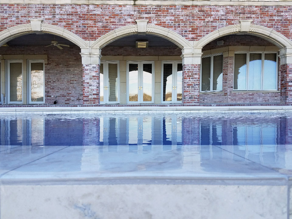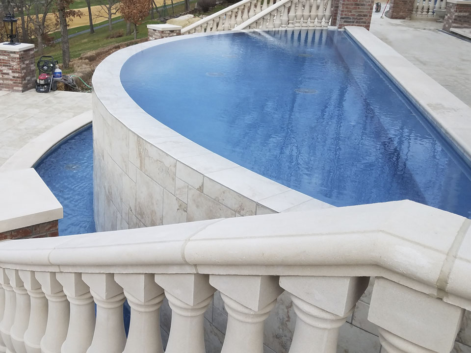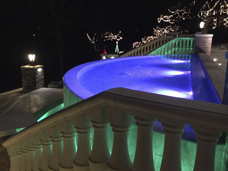 Sometimes a project comes along that you know is going to be different and special. This project is actually a fountain, though it was built like a pool. The grand design of this home with its many beautiful arches is placed high up overlooking a golf course directly opposite the clubhouse. The steepness of the property allowed for a nice vanishing edge. The vanishing edge is curved to complement the home’s arches and is nearly 60 feet in length and drops 8 feet to the basin below. The basin has color-changing lights that create an amazing light show that can be perfectly viewed from the clubhouse across the golf course. Add to that the curved staircases down both sides that lead to a grand staircase that takes you down to the golf course. This is truly a one-of-a-kind project.