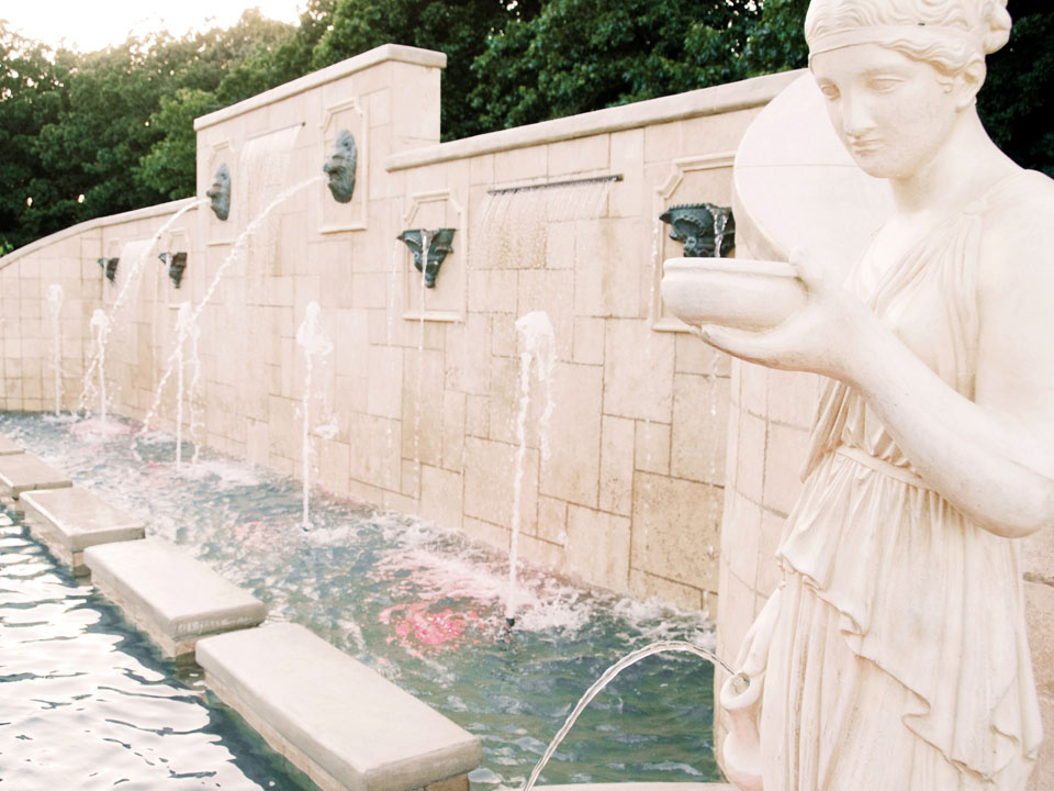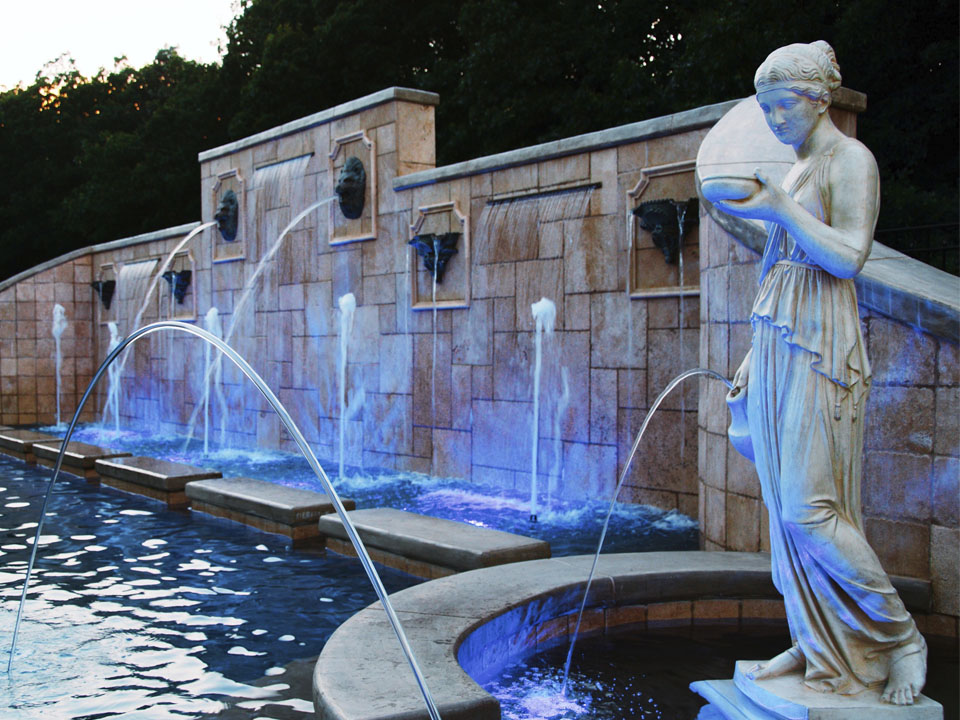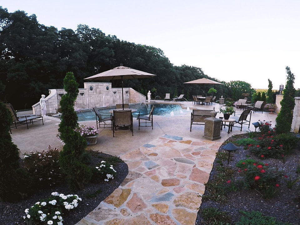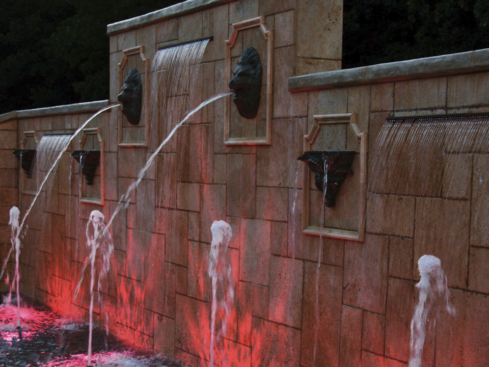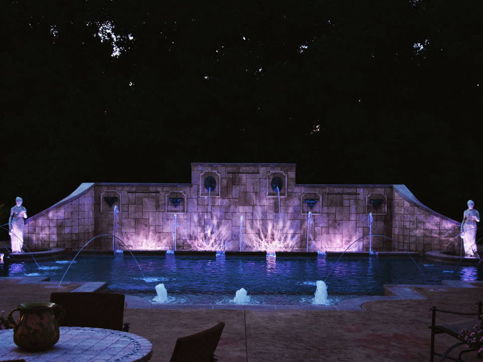 This custom gunite swimming pool has a little of everything. From 24 water features, stone pebbled beach entry, travertine tiled fountain wall to a custom blended plaster color giving it a greenish blue water color. Water features like the statues pouring water from urns, rainfall curtains, and color LED lighted bubblers and deck jets give you moving water everywhere you look! Numerous color LED lights in the pool really make it come alive after dark.