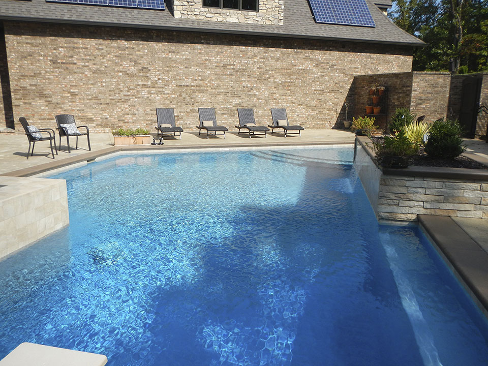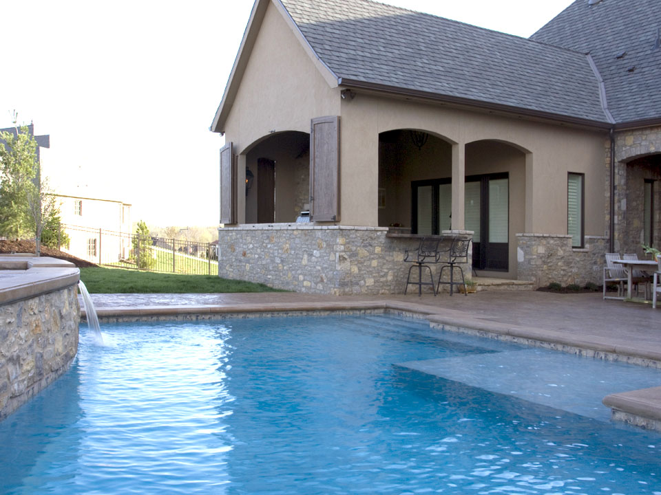The linear look of this custom gunite pool and spa combo give it a simple yet elegant flair. The spa overflowing gently into the pool appears to be floating in the pool. With an abundance of bench space and nice big tanning ledge entry there’s plenty of room for family and friends.